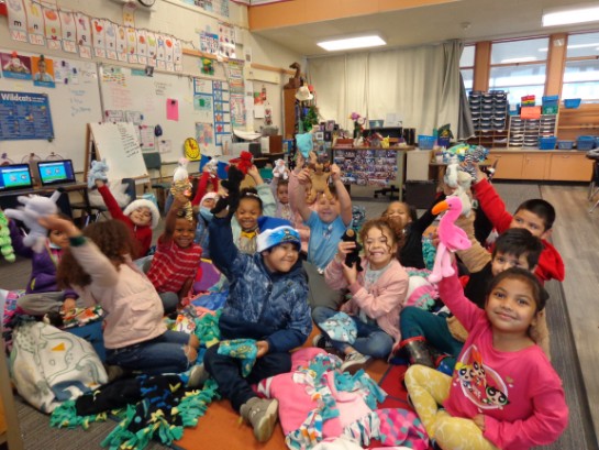 We also have an annual Kindergarten Project. We collect Beanie Babies all year long and volunteers make double-fleece no-sew blankets. In the fall, we pick as many as we can of the lowest-income elementary schools in Sacramento/Placer County and find out how many kindergarteners they have. Before the winter holidays, we give EVERY kindergartener a warm double-fleece blanket and a Beanie Baby in a pouch.